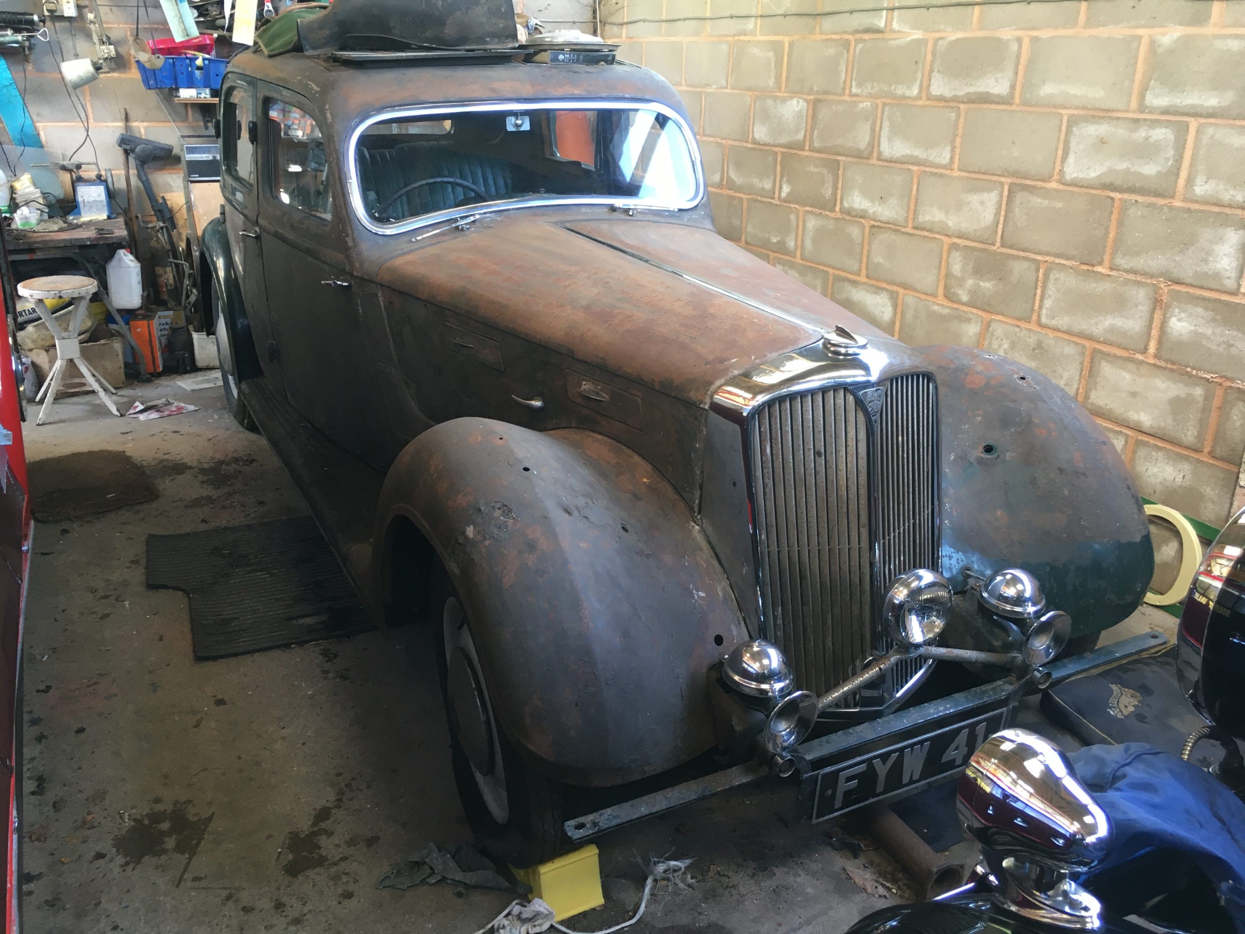 Rover 16 for sale. Off the road (garaged) for 40 years after suffering heat damage from an external fire. The paint was burnt off the front wings, bonnet top, roof, engine sides and the drivers door. The roof material was also lost. The car is absolutely solid, and was in very good condition prior to the fire. The doors shut like a railway carriage. There is only surface rust, mainly where the paint was burnt off other than the o/s/f wing which has a couple of holes, but it is eminently repairable. The head and sidelamps have been re-chromed (not re-fitted), as are the wing mirrors. I have not tried starting her, but the engine is free. The interior leather is incredible. Even the stitching on the seats is good. Fitted with a period KL heater and stainless steel exhaust. Some history with the car, some of which is quite intriguing. There are photographs of the car prior to the fire. Work needed: repaint; new carpets; re-wiring; checking mechanically: front floor boards